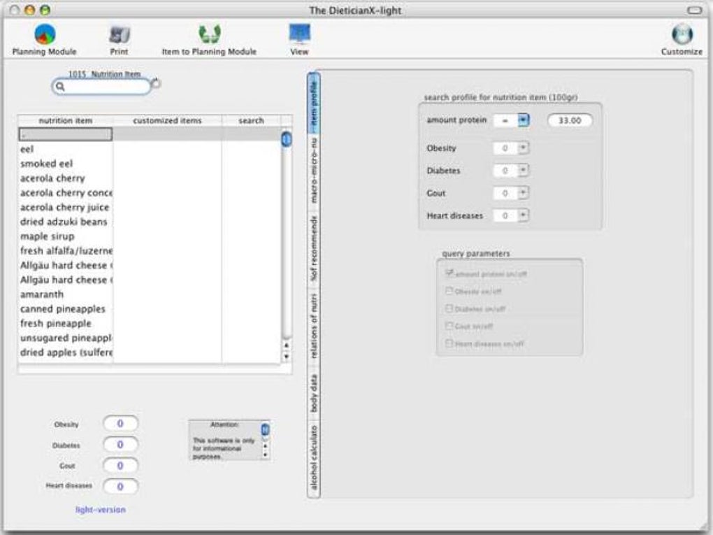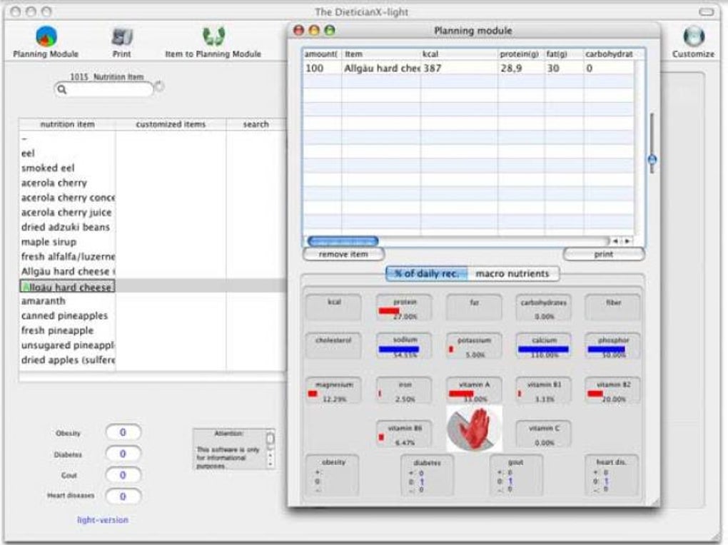 DieticianX es tu dietista personal, una base de datos que puede servirte como punto de partida para empezar en serio una dieta. Además, los alimentos llevan indicaciones en el caso de tener ciertas enfermedades como la diabetes, la obesidad, la gota, o los problemas cardiovasculares; podrás seleccionar los alimentos en todo conocimiento de causa sin que tu salud corra riesgos.